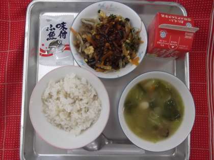 今日の給食は、麦ごはん・トックスープ・ビビンバ・牛乳・乾燥小魚でした。