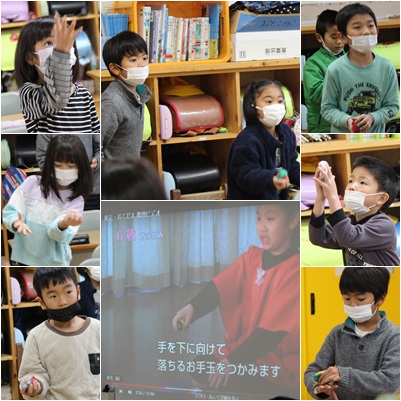 雨が降っていたので、教室でお手玉をしました。動画を見ながら、片手で投げ上げて、片手でとったり、上からつかんだり、手の甲にのせたり、いろいろな技に挑戦しました。ドッチボールをキャッチするのと同じで、取るときにはお手玉の速さに合わせて手を引きながら受けることを学びました。コツをつかむまで何度もチャレンジしていました。