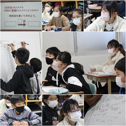 割合の問題です。もとにする量、比べる量を見分けるのが難関です。関係図にかいたり、線分図にかいたりしながら、文章の中のどれがもとにする量で、どれが比べる量が考えていきます。今日は、線分図の書き方を学びました。「数の大小関係から、こちらがもとにする量です」と発表していました。なぜそう思ったか根拠を明らかにすることが大切ですね。