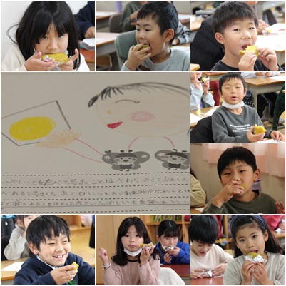 11月末に収穫したサツマイモをいただきました。ふかし芋にしました。野菜名人の皆様のおかげで、まるまるとした大きな芋が収穫できました。おいしそうに食べている写真だけで申し訳ありませんが、お届けいたします。ありがとうございました。