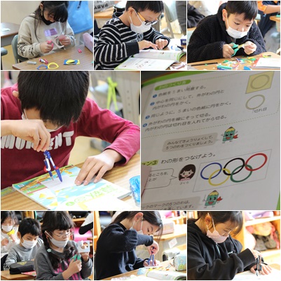 今日のミッションは、オリンピックマークを作ることです。「コンパスで、うまく描けないんだよね、ずれちゃうんだよ」と必死に取り組んでいました。5つの円を切り取るには10個の円を描く必要があります。