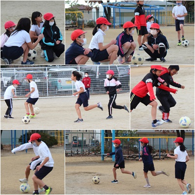 4人グループで2対2に分かれて2分間、ボールを相手に取られないようにキープします。2人で挟み込んでボールをとるのもOK、ドリブルで動き回って逃げ続けるのもOKです。コートに制限がないので、運動場全面を使い、結構な運動量です。寒さが吹き飛びました。