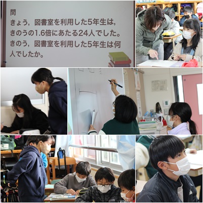図と線分図の両方を書いて、割合の問題を解きます。この時間はティームティーチングで複数の教員が教えるので、手が止まっていると、すぐに手を貸すことができます。割合の学習では、問題数をこなすことも大切ですね。