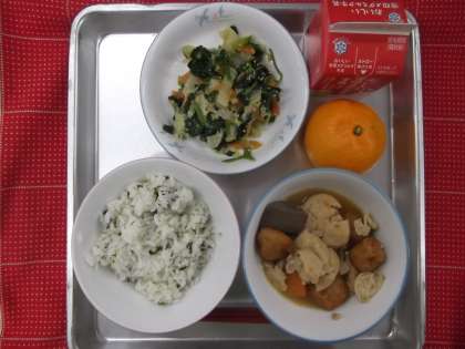今日の給食は、わかめごはん・関東煮・アーモンドあえ・牛乳・みかんでした。