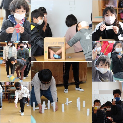 折り紙で折った入れ物を見つける「宝探し」では、入れ物の中に1等とかラッキー賞などの紙が入っていました。「ボーリング」では、倒したピンの中に、クイズの紙が入っていて、クイズに正解すると賞品がもらえました。その他にも「絵描きしりとり」「新聞のりじゃんけん」「物あてクイズ」「爆弾ゲーム」などたくさんのゲームが用意されていました。
