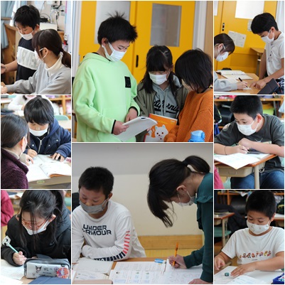 復習問題に取り組んでいました。4年生の素晴らしいところは、分からない問題をそのままにしないところです。TTの教師に聞いたり、友達に聞いたり、教えてくださいコーナーを作ったり、その時間のうちになんとか解決しようと努力します。何度も「聞いて理解して」を積み重ねることによって、身に付いていきます。がんばるぞという熱気が感じられました。