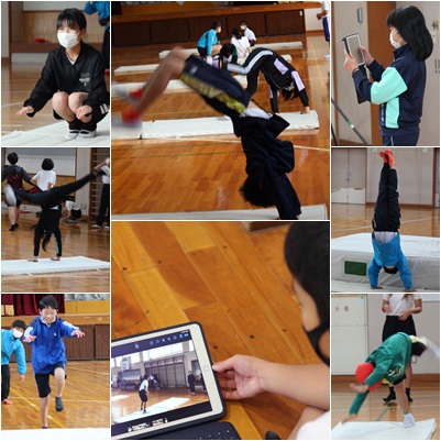 側転、倒立前転、開脚前転など自分が決めた技の練習をしていました。「いくよ、見てて」と声をかけながら、何度も挑戦していました。友達からもらうアドバイスはとても効果的です。また、自分では、きれいにできているつもりでも、録画したものを見ると思ったようにはできていないこともあります。「あれ、今、偶然うまくいった」など感覚をつかみながら繰り返し練習していました。