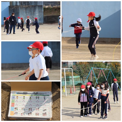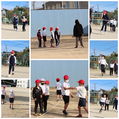 寒い中でしたが、元気になわ跳びです。なわ跳びカードにあわせていろいろな跳び方ををしました。今日は長縄で「8の字」にもチャレンジです。長縄を駆け抜けたり、「大波小波」で練習したりしていたので、リズムよく跳ぶことができました。みんなで長縄を跳び、体も心も温まりました。