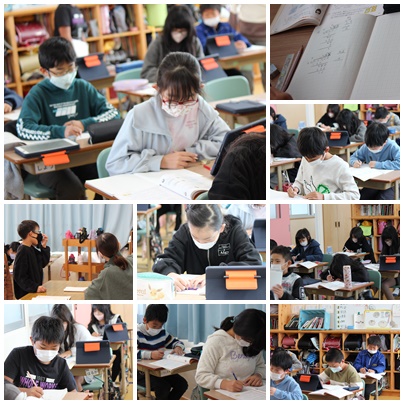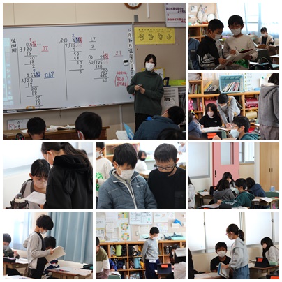 小数のわり算、今日は商を概数で表します。わり進めていく計算も、概数の表し方もどちらもすでに習っています。いつも今までの学習を生かして新しいことに取り組む視点を意識させているので、初めての内容でも友達に計算の仕方を説明することができました。説明することで、より理解が深まり、計算問題にも意欲的に取り組むことができました。