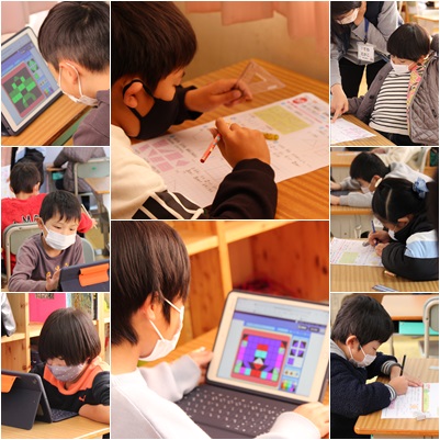 テストに取り組みました。終わると算数のドリルパークの問題を解きます。タブレットの画面をのぞくとゲームの画面のようにみえますが、図形の単元で学んだ三角形や四角形をしき詰める模様づくりの課題でした。その他にも2学期に学習した問題に取り組んでいました。