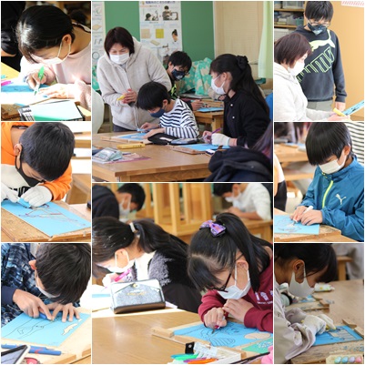残す線、彫るところを考えながら彫り始めました。教科担任からもアドバイスをもらいながら、丸刀、三角刀等、どの彫刻刀で彫るとよりよい表現ができるか考えて彫り進めました。昔、美術の先生に、版画で白くする部分の彫りかすは短くて細かい方がよいと聞きました。少しずつていねいにということですね。