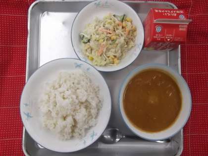 今日の給食は、麦ごはん・ハヤシシチュー・しらす干しと切干大根のサラダ・牛乳でした。
