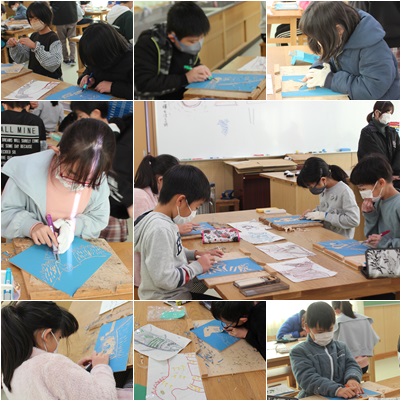 4年生はテーマが動物なので、毛並みなど白い部分が多く、どんどん彫り進めていました。白と黒のバランス、どうすると立体感がでるかを考えながら彫り方を工夫していました。彫る音しか聞こえないぐらい集中して彫っていました。