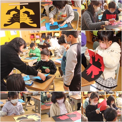 ぐにゃぐにゃと引いた線に沿って、スタートからゴールまで1本の線をハサミで切ります。できたものを2つに分けて黒い紙に貼ると、モンスターや恐竜が現れました。ハサミを回すのではなく、紙を回すと上手に切れますね。