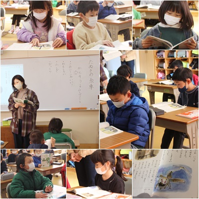 担任が、「たぬきの糸車」の範読を始めました。目で追いながらしっかりと聞いています。「キーカラカラ キーカラカラ」「キークルクル キークルクル」のところでは、一緒に読む小さな声が聞こえてきました。お話の世界にすっかり入り込んでいました。