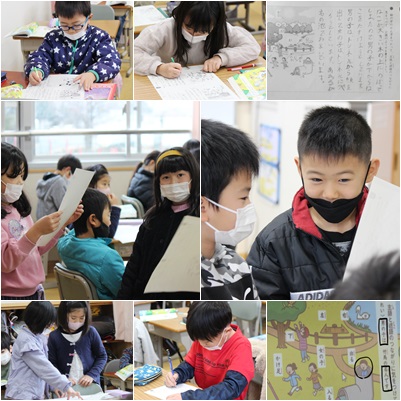 絵の中の言葉を使って、主語と述語のつながりに気をつけて公園のようすを書いていました。「何がどうした」をきちんと書くことが今日のめあてです。早くできた人は、読み合って待ちます。うまくお話のようになっている人もいました。