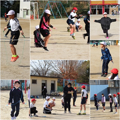 今日が縄跳び運動の最後の授業でした。冬休み中に練習した成果を披露しています。写真では、何跳びが分からないのが残念ですが、後ろ跳びのかけ足跳びや二重跳びなど難しい技ができるようになっていました。まだ、寒い日が続きますので、練習を続けてくださいね。
