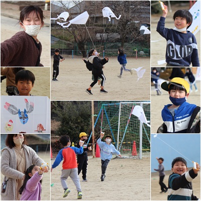 作った凧をあげました。友達と糸が絡まないよう、それほど長くは伸ばさないようにしました。ずっと走り続け、「疲れた〜」と少し休憩です。でも、すぐに走り始めていました。元気です。そのうちに風にのせて上手くあげるコツをつかんでいました。