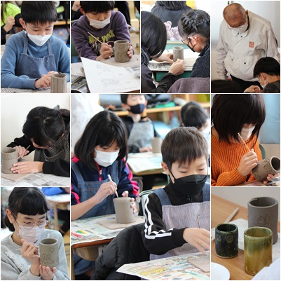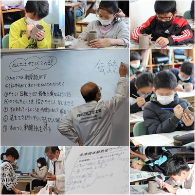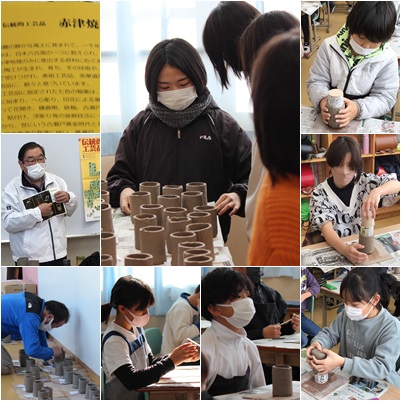 赤津焼工業協同組合の皆さんにおいでいただき、湯飲みを作りました。タタラ作りで湯飲みを作りました。