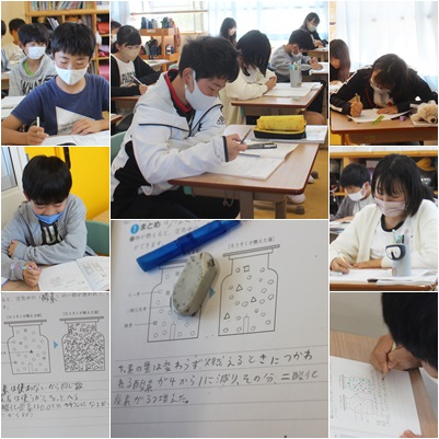 「空気の成分の割合から言うと〇対〇だから、酸素は、〇個にした」など、なぜそのようにしたかを説明します。それぞれに理由がしっかりと書かれていたので、この後の話し合いが楽しみです。