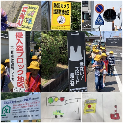 1年生は、通学路に設置されている安全をよびかける標識や安全のためにあるものを見つける探検に出かけました。歩道を歩くときや横断歩道を渡るときには、先日の交通教室で学んだことを実践しました。何に気を付ければよいのかよく考えて、安全に登下校してくださいね。