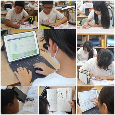 テストが終わると、各自、県名についての復習です。タブレットでミライシードの問題を行ったり、インターネットで県の形で県名を当てるクイズに挑戦したり、国語の教科書で県名の漢字を勉強をしたり、地図に書き込んだり、多様な学習方法で取り組んでいました。
