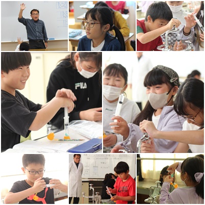 教室で予想を立てた後、理科室で実験です。注射器に水を入れて、押し縮めます。空気と比べるとどうでしょうか?疑問に思ったことを自分で試して良い時間もあります。皆、実験にのめり込んでいました。