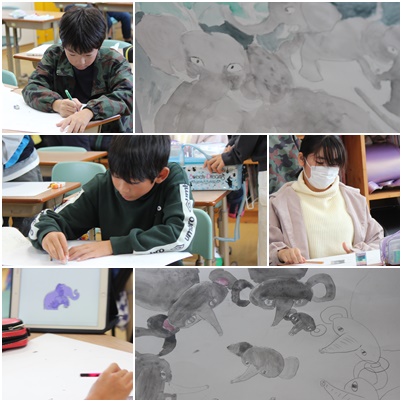 同じ象でも上から、横から、斜めから、下からと視点を変えて見ると、全く違う構図になります。また、色の塗り方によっても立体感や遠近が表現できます。片付けの時間ですべての作品を見ることができませんでしたが、作品にそれぞれのよさが感じられました。