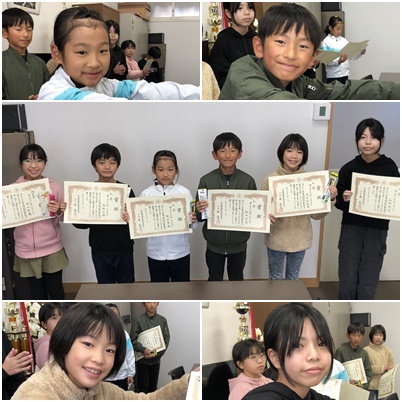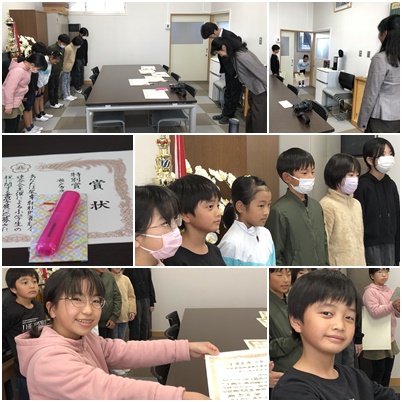 尾東納税貯蓄組合連合会主催による小学生の税に関する書写展の表彰を行いました。校長室前の廊下で待っているときから、皆、姿勢がよく、清々しい態度でした。特別賞に選ばれた人は、年中の頃から習字を習っており、普段もきれいな字を書くよう心掛けているそうです。すばらしいですね。