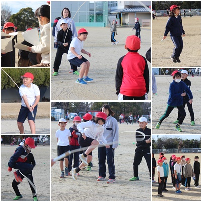 大縄跳びに挑戦です。縄を回すのが大変で、回し手の2人が上手くタイミングを合わせないと、たるんで跳びにくくなってしまいます。縄の長さも影響します。「せーの」と声をかけながら、がんばっていました。連続で4人跳べたのが、今日の最高記録でした。