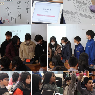 グループで選んだ詩について「詩の魅力」を競います。トーナメントで対戦し、チャンピオンを決めます。筆者の考えについて解説したり、リズムや表現の工夫などを紹介したりして、グループ独自の解釈や感想を発表します。皆の心をぐっと引きつける要素が必要です。聞いている審査員も真剣でした。
