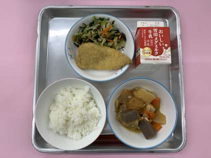 今日の給食は、ごはん、関東煮、ニギスフライ、昆布あえ、牛乳でした。