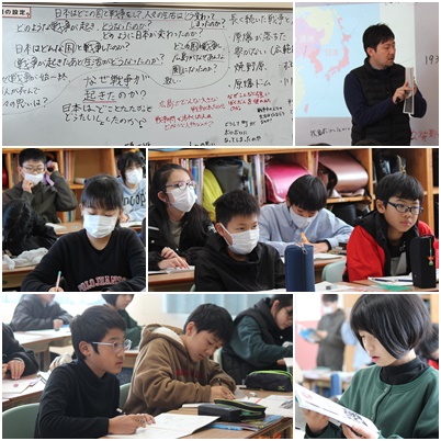 戦争の時代の写真を見て、疑問に思ったことや調べたいことをもとに課題を考えました。ホワイトボードに書き出した意見をまとめ、単元の学習課題をしぼり、今後の計画を立てました。早速、満州事変について、当事者になったつもりで、どう考えてどのようなことをしたのか話し合いが始まりました。