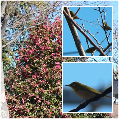 「チルチル チルチルチル」 と今朝は、にぎやかな鳴き声が聞こえていました。メジロが10羽ほどサザンカの木の辺りに集まってきました。ちょうど枝にとまった瞬間を撮ることができました。