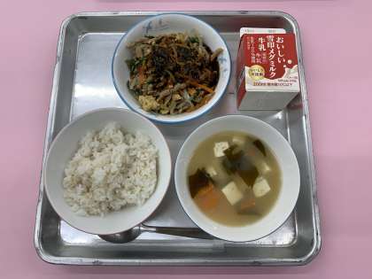 今日の給食は、ごはん、ビビンバ、トックスープ、牛乳でした。