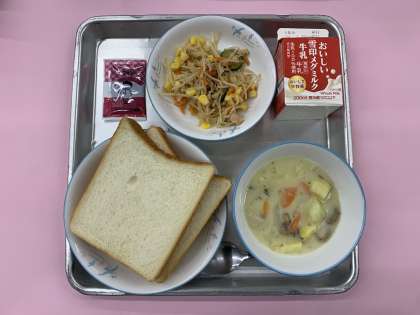 今日の給食は、スライスパン、さつまいもシチュー、ごぼうサラダ、牛乳、大豆チョコでした。