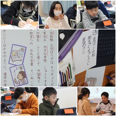 習った漢字の中から1文字選び、「五・七・五」になるように言葉を考えながら、音訓カルタを作っていました。言葉を決めて、絵を描いて、色をぬって、大忙しです。