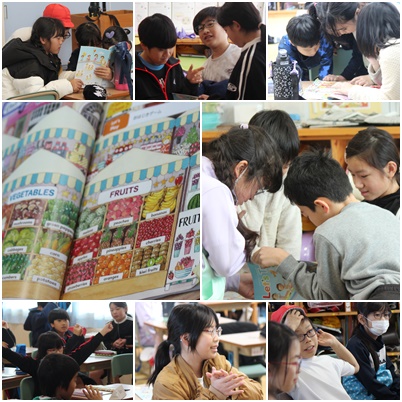 輪切りの写真を見て、お店に並んだ「FRUITS」「VEGETABLES」の中からどの食べ物かを当てます。グループで相談して、答えます。輪切りはなかなか難しかったようで、正解したときはうれしそうでした。