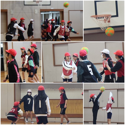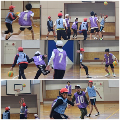 バスケットボールの試合でした。クラブチームの子が声をかけ、速いパス回しでゴールをねらいます。攻撃、守りの入れ替わりに、どちらのチームも素早く反応していました。途中で出場する人は入れ替わりますが、なかなかの運動量でした。