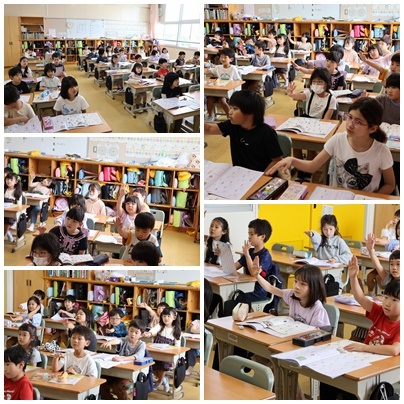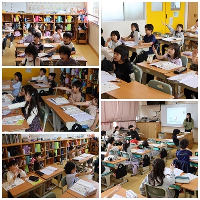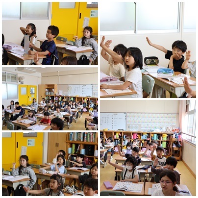 「とめ」「はね」「はらい」など、体を使って覚えていく書写の体操です。みんなよい姿勢で取り組むことができました。