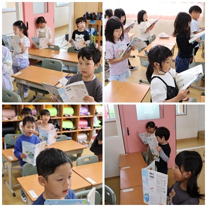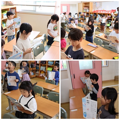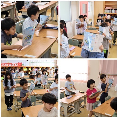 「あいうえおのうた」をみんなで読みました。口の開け方を意識してしっかり読むことができました。立って読むとさらに姿勢もよくなります。