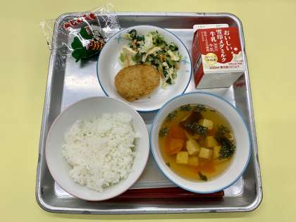 今日の給食は、ごはん、若竹汁、かつおカツ、春キャベツのあえもの、かしわもち、牛乳でした。