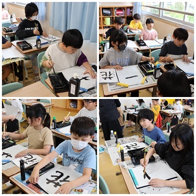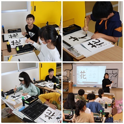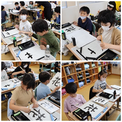 3年生で学んだ点画の筆づかいを思い出しながら「花」と書きました。穂先の向きに気を付けると、字形が整って書けます。