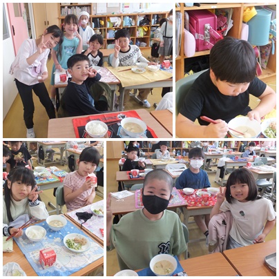 今日の給食は、ごはん、洋風団子汁、ツナの甘辛煮、ハリハリづけ、牛乳でした。
