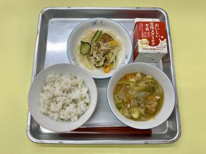 今日の給食は、麦ごはん、うずら卵といかの中華煮、中華あえ、牛乳でした。