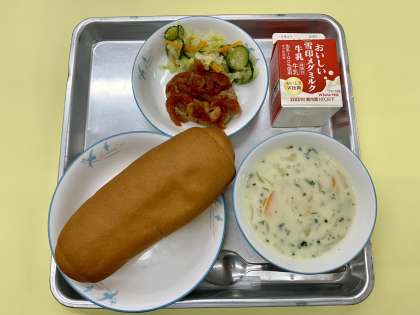今日の給食は、ロールパン、チキンチャウダー、蒸しハンバーグのトマトソースかけ、ミニフレンチサラダ、牛乳でした。