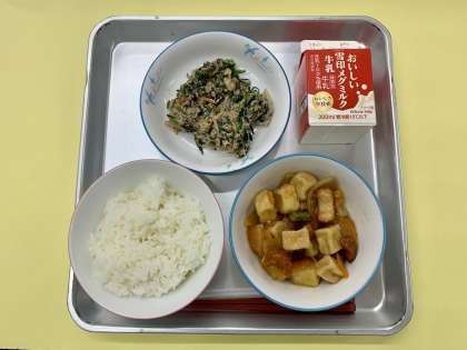 今日の給食は、ごはん、凍り豆腐の揚げ煮、千草あえ、牛乳でした。