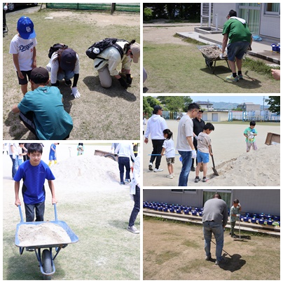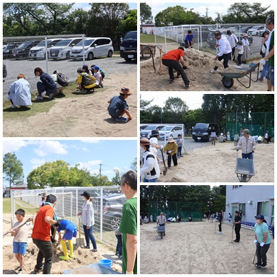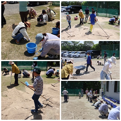 お休みにもかかわらず、小学生、中学生、そして保護者の方々、50人以上の方に来ていただきました。草取り、エアレーション、目砂入れとたくさん作業はありましたが、予定の1時間で無事に作業を終えることができました。黙々と力仕事に取り組む姿も、楽しく草取りをする姿もみんなで協力する姿がとても素敵でした。本当にありがとうございました。