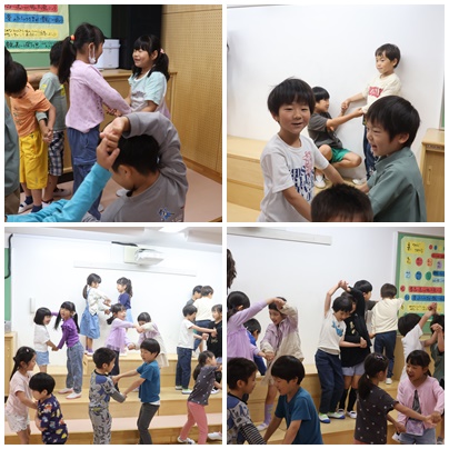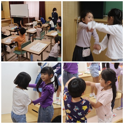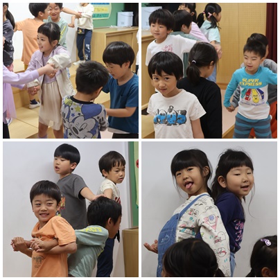 わらべうたの「なべなべ」です。二人組で楽しく動くことができました。