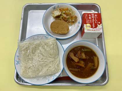 今日の給食は、ソフト麺、肉みそかけ、愛知県産根菜コロッケ、キャベツと厚あげのしょうがおかか和え、牛乳でした。